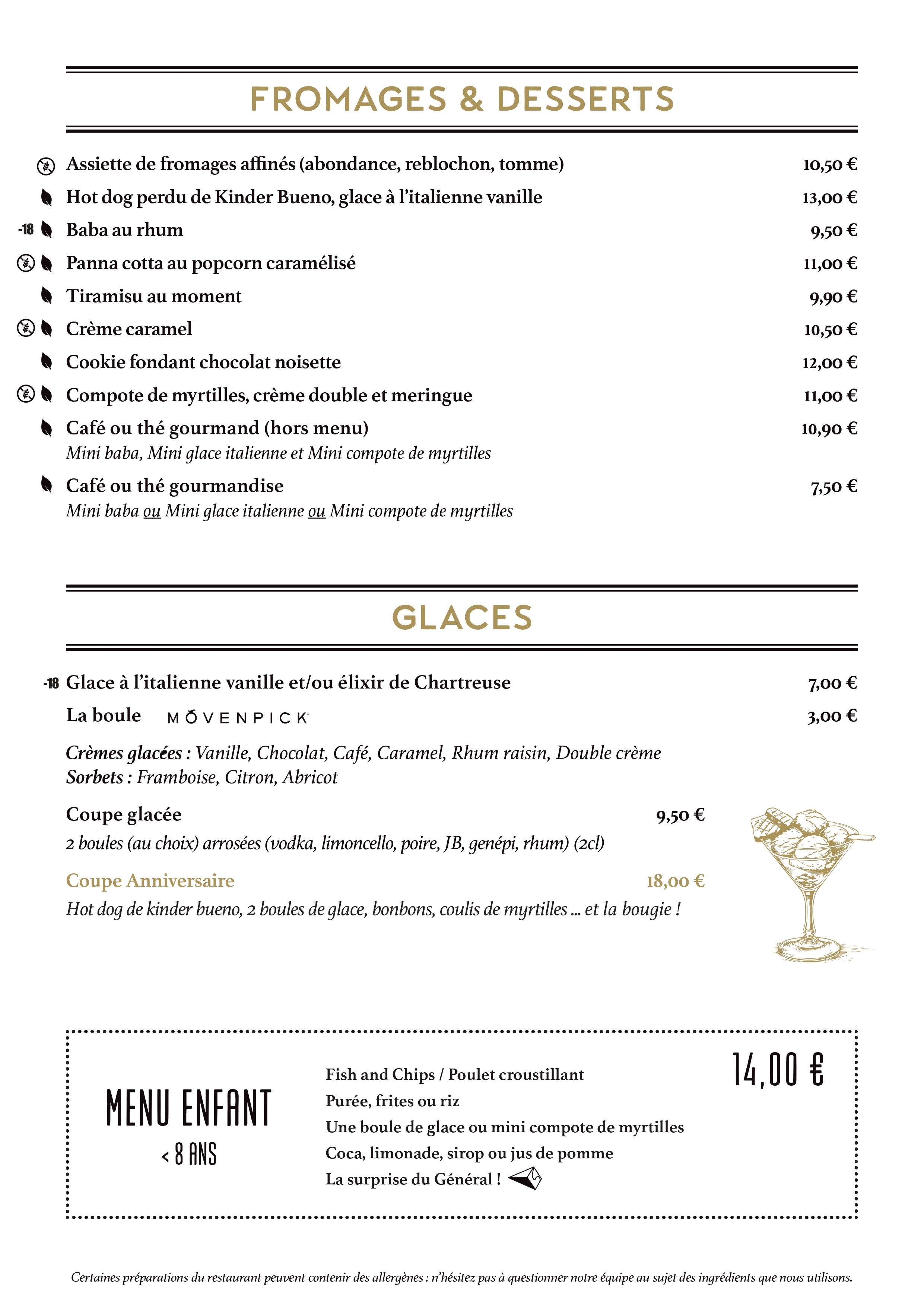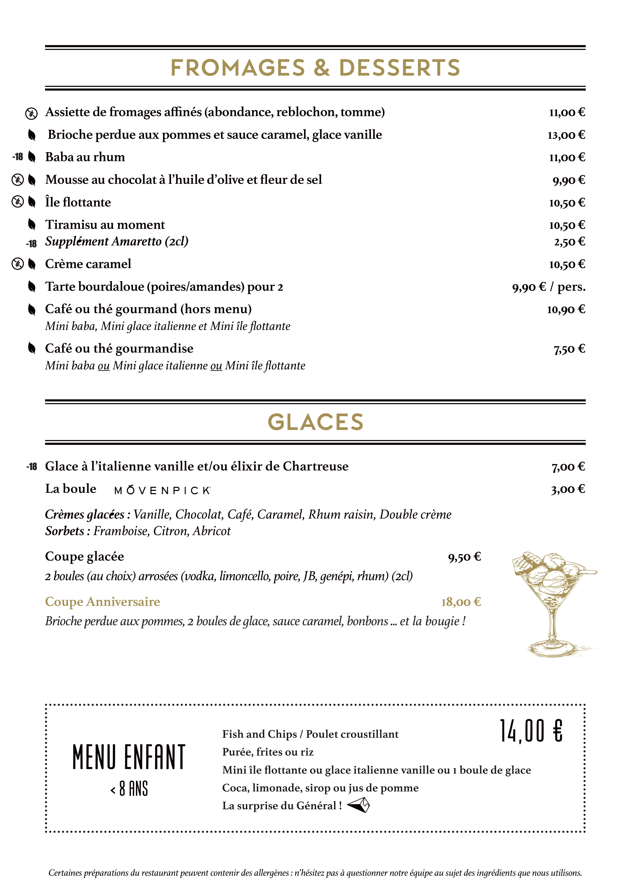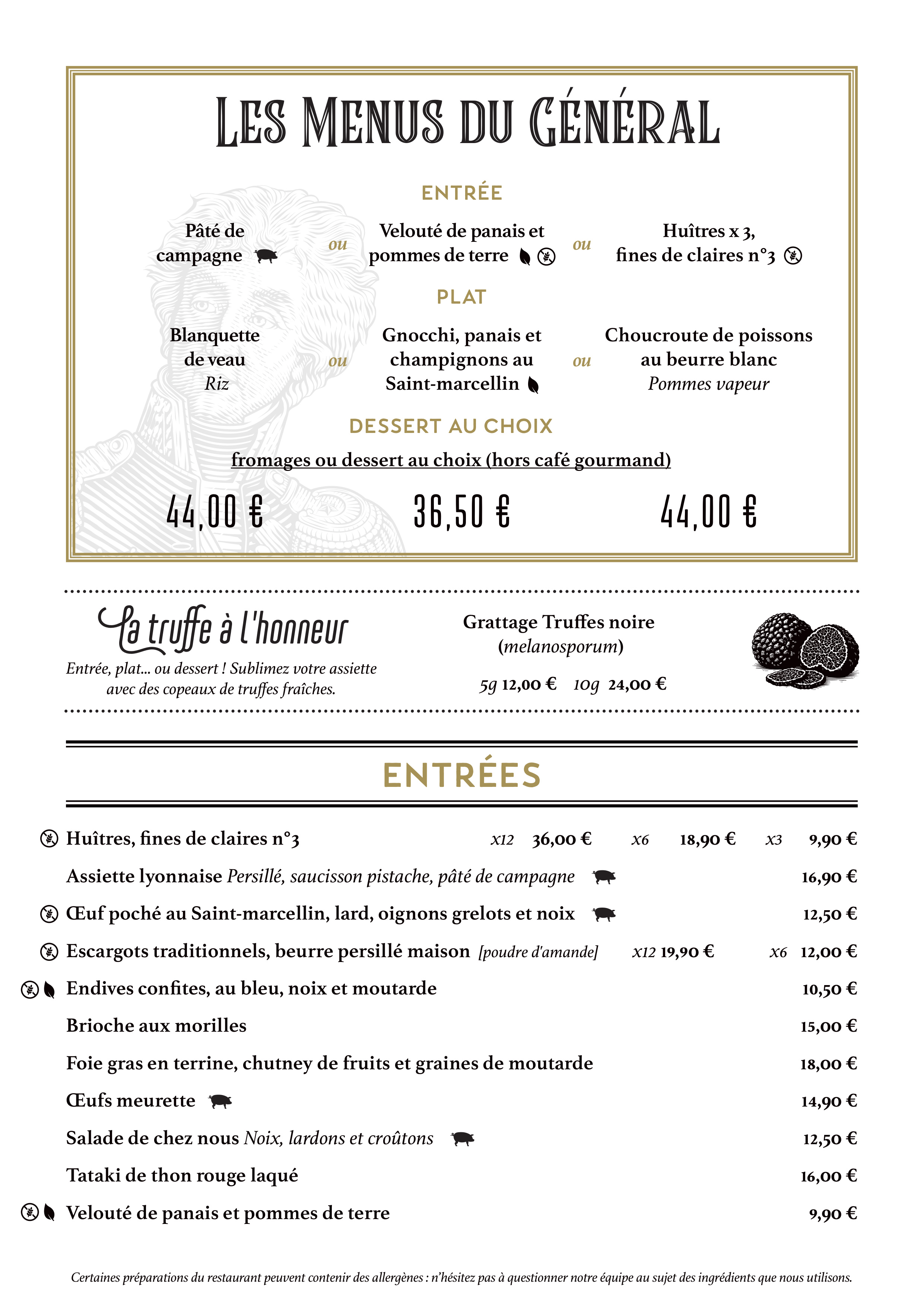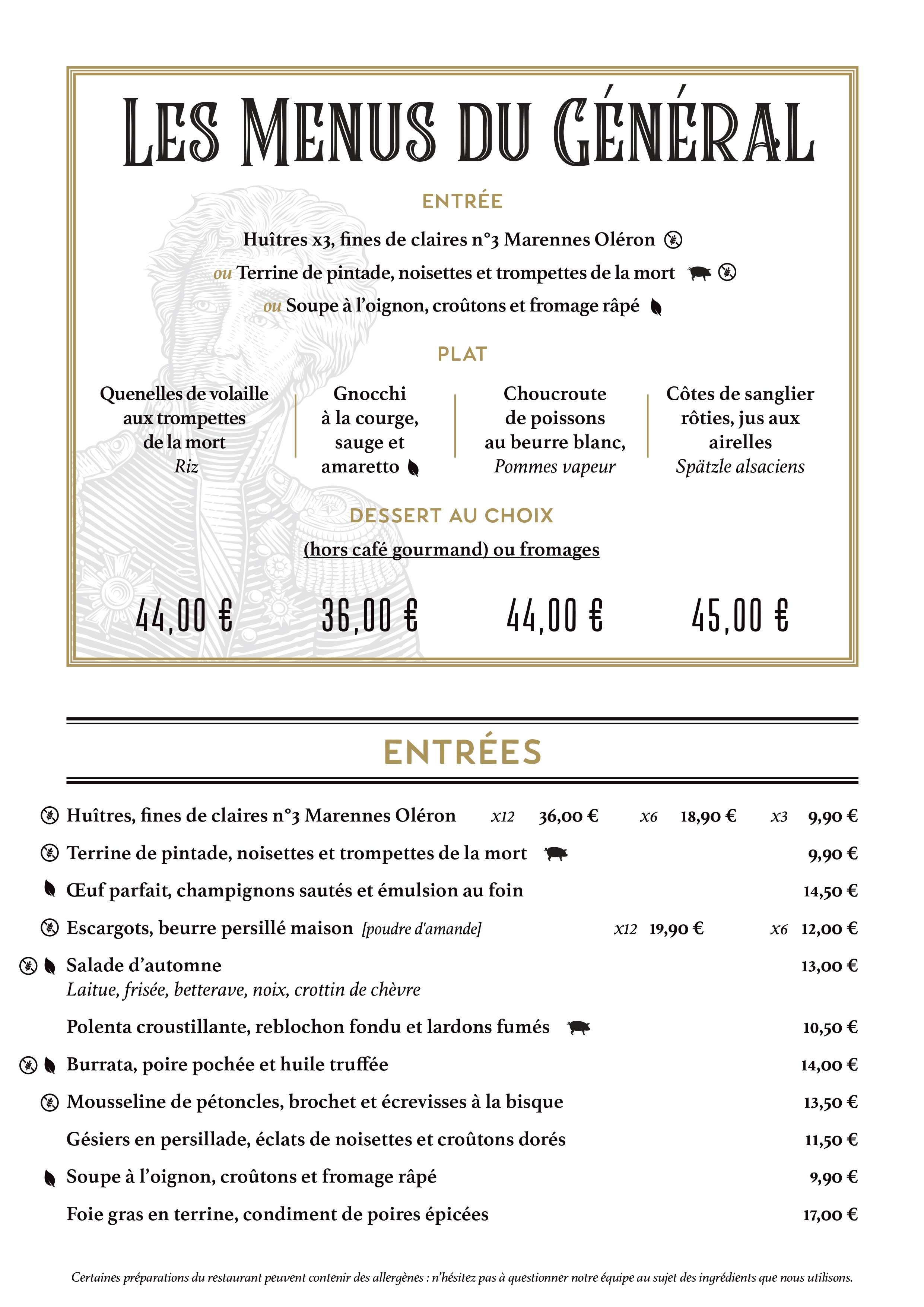 Chez le Général, pour chaque saison, nous vous proposons une nouvelle carte. Vous ne mangerez jamais 2 fois le même repas chez nous, des classiques, des nouveautés, de l’audace, toujours du goût, toujours du plaisir et surtout du beurre.